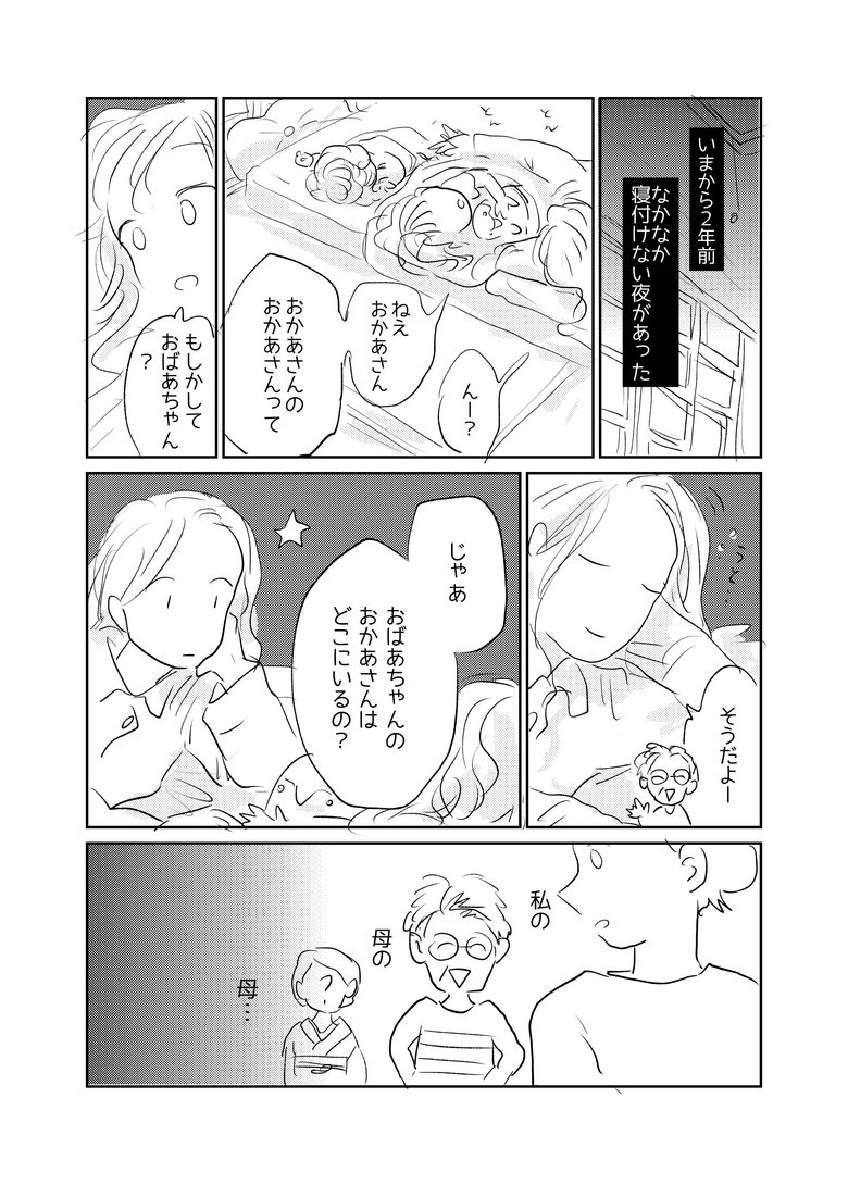 寝かしつけの際に、さざなみさんは上の娘さんから「おかあさんのおかあさんってもしかしておばあちゃん?」と尋ねられます。「そうだよ」と答えると、続いて「おばあちゃんのおかあさんはどこにいるの?」と質問が。