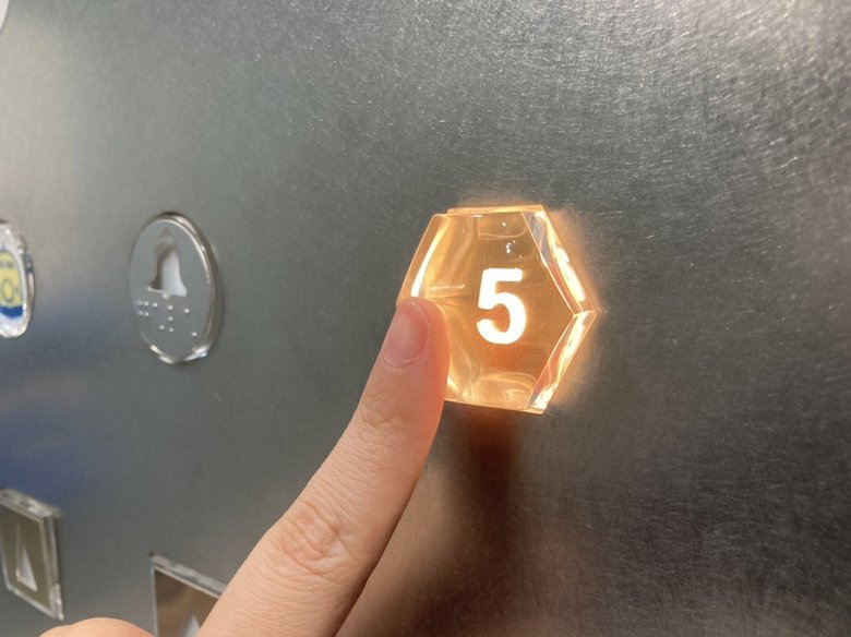 少し厚みがある、六角形のボタンが推しです。島田電機製作所の職人のなせる技だと思うのですが、アクリルの美しさを十二分に感じさせる宝石のようなボタンです。弊社のこだわりでもあるのですが、押し心地も抜群です。出社したらまずこのボタンを押すのが日課で、押すとやる気にさせてくれる私にとって大切なボタンです。