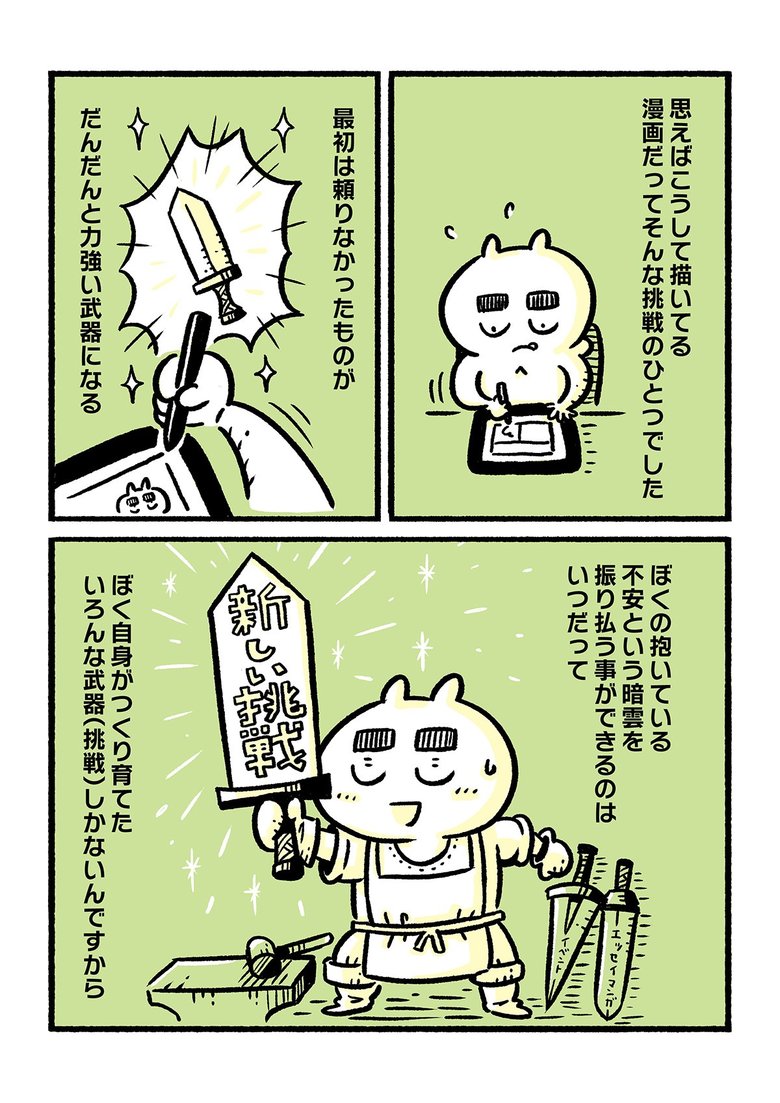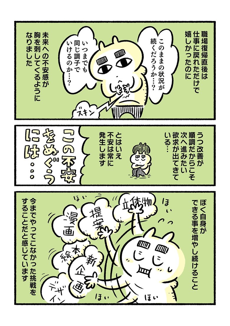 連載トップへ戻る ズキンと痛む「仕事への不安」を拭い去る“武器”という名の“挑戦” ミヨシ 4コマ・漫画 2022.07.21 「仕事をがんばりたい」という前向きな気持ちが、ときに諸刃の剣になることも少なくありません。それでも勇気をもって踏み出した1歩は、何歩下がったって、きっと前に進んでいるはず──。「うつやすみ」を経て職場復帰を果たしたミヨシさんが、日常にある小さな変化や気づきを描きます。 漫画を読む 【第16話】ズキンと痛む「仕事への不安」を拭い去る“武器”という名の“挑戦” 作/ミヨシ この記事の写真をすべて見る(4枚)