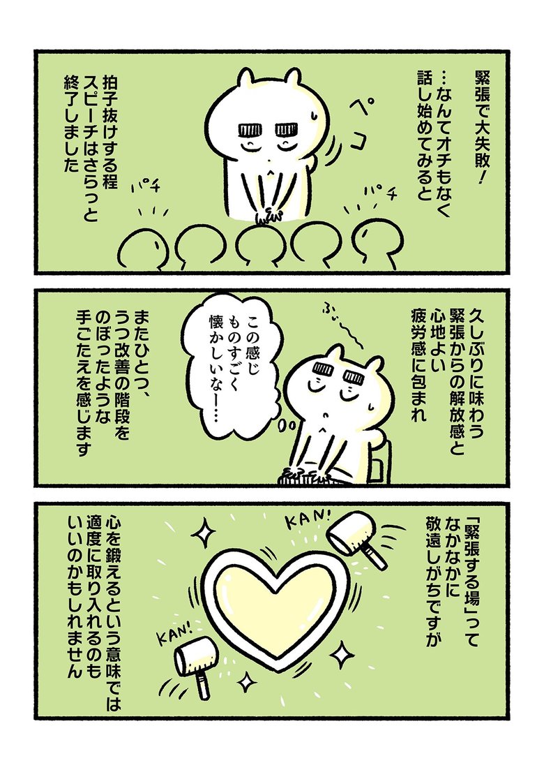 連載トップへ戻る 職場復帰後の「朝礼スピーチ」が嫌すぎる…緊張と不安の間で揺れる思い ミヨシ 4コマ・漫画 2022.07.28 「仕事をがんばりたい」という前向きな気持ちが、ときに諸刃の剣になることも少なくありません。それでも勇気をもって踏み出した1歩は、何歩下がったって、きっと前に進んでいるはず──。「うつやすみ」を経て職場復帰を果たしたミヨシさんが、日常にある小さな変化や気づきを描きます。 漫画を読む 【第17話】職場復帰後の「朝礼スピーチ」が嫌すぎる…緊張と不安の間で揺れる思い 作/ミヨシ この記事の写真をすべて見る(4枚)