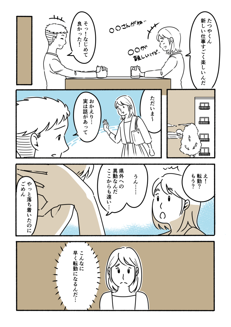 職場に馴染み仕事にやりがいを感じ始めたみちこでしたが、早々にたつやの転勤が決まってしまいます。仕事を辞めたくないもどかしさをわかって欲しかっただけなのに、寄り添ってもらえないと「そうじゃないのに」と悲しくなりますね。