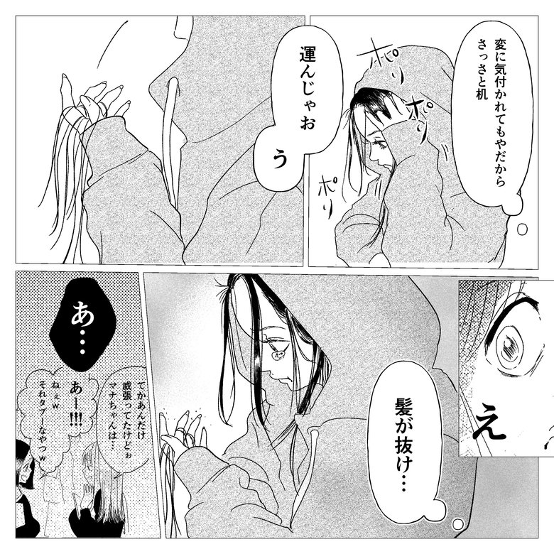 マナの髪が抜ける瞬間を目撃した芸子。マナのせいで部活に行けなくなったり、辛い思いをしたのは間違いないけれど、もし当時のマナに寄り添う大人や親友がいたら──。芸子は、彼女の厳しい小学生時代を思い、これまでのわだかまりを浄化させたのでした。