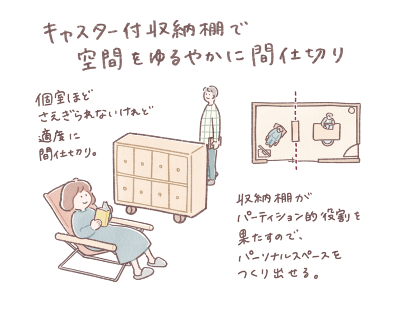 リビングをゆるやかに区切るパーティションとして使えるのです。