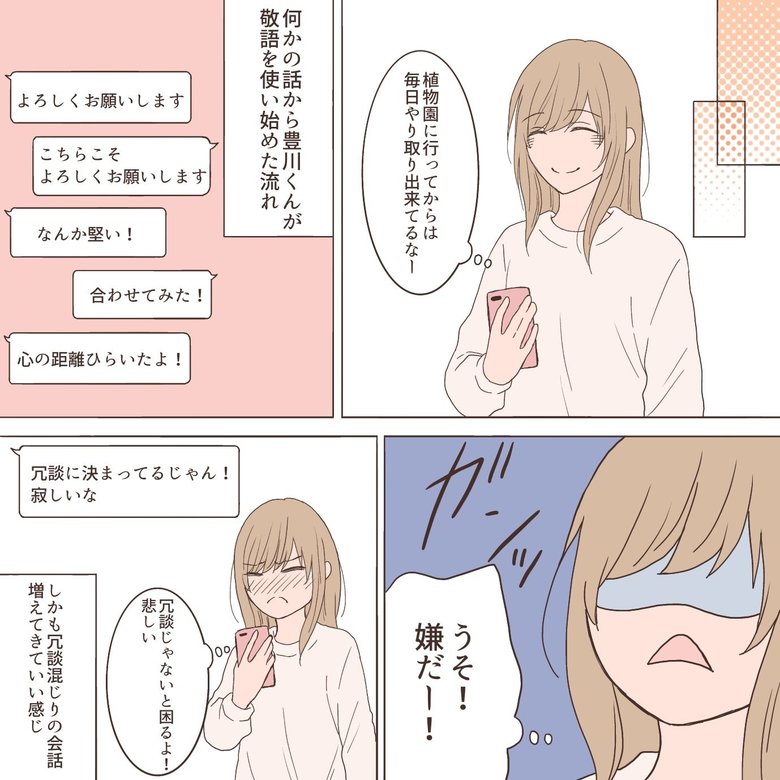 一度も話すことができないまま会うこともなくなったけれど、趣味の少女漫画がお互い好きと知り、連絡をとるうちに二人の距離は急接近していき冗談も言い合えるほどに。