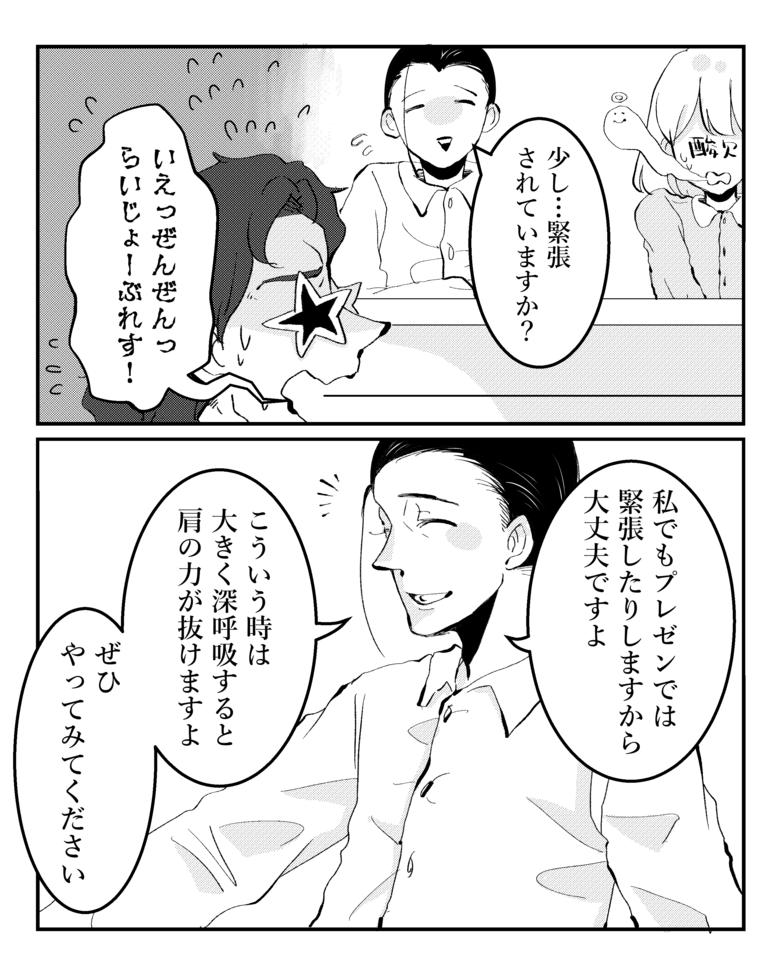 学生の緊張は、初めて面接官の仕事に臨んだハトちゃんにも伝染。「深呼吸」の提案に学生より先に反応し、その場の注目を集めるハトちゃんでした。