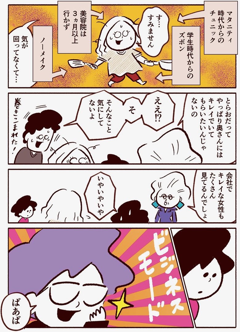 連載トップへ戻る 姑の「おしゃれしたら?」に対する息子のフォローが泣けてくる 4コマ・漫画 2022.09.09 うちの息子は、なんと「ビジネス系3歳児」だった⁉︎令和時代の家族についてのリサーチをもとに浮き彫りになった家族の課題に、たろうくんがビシッと切りこんでいきます。新しい家族のカタチ"共働きスマート家族"、その行方とは── 。 漫画を読む 第136話「姑の『おしゃれしたら?』に対する息子のフォローが泣けてくる」(後編) 作/児島衣里 この記事の写真をすべて見る(2枚)