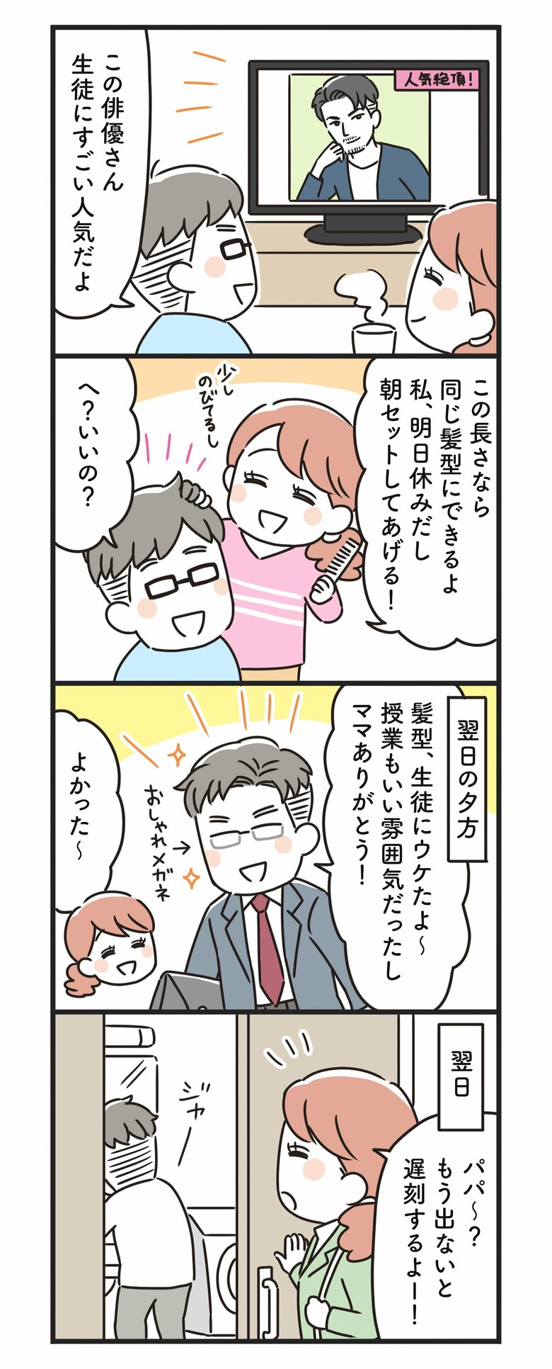 マミの力を借り、人気俳優の髪型を真似して「オシャレな先生」に変身したトシオ。すっかり気を良くし、翌日も同じスタイルを自分で再現しようとしたけど…!?