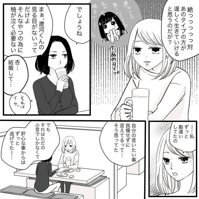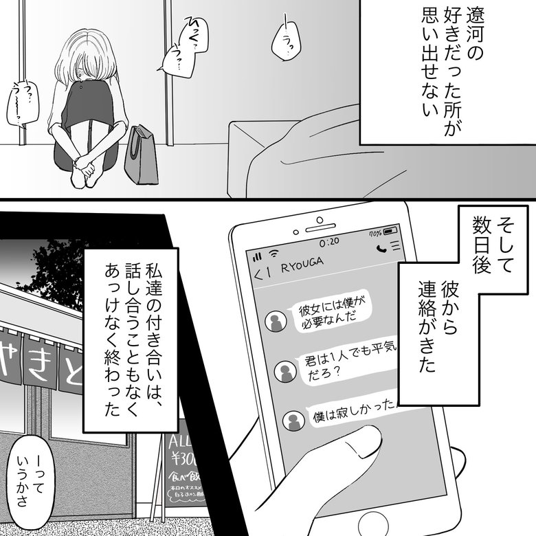 連載トップへ戻る 「彼は悪くない!私が勝手に」計算高そうな浮気相手に放ったひと言が痛快 おみき 4コマ・漫画 2022.10.18 漫画を読む 衝撃の浮気シーンを目撃しまっても、強くたくましい振る舞いであざとい女と彼氏を追い払った柚はかっこいいですね。しかし、一人になって涙を流す姿は裏切られた悲しさだけでなく、自分のことも責めているようでした…。 作/おみき この記事の写真をすべて見る(6枚)