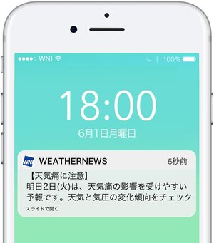 そのためアプリには「注意」「警戒」の予報がある日、その前夜に通知する「天気痛アラーム」機能があります。