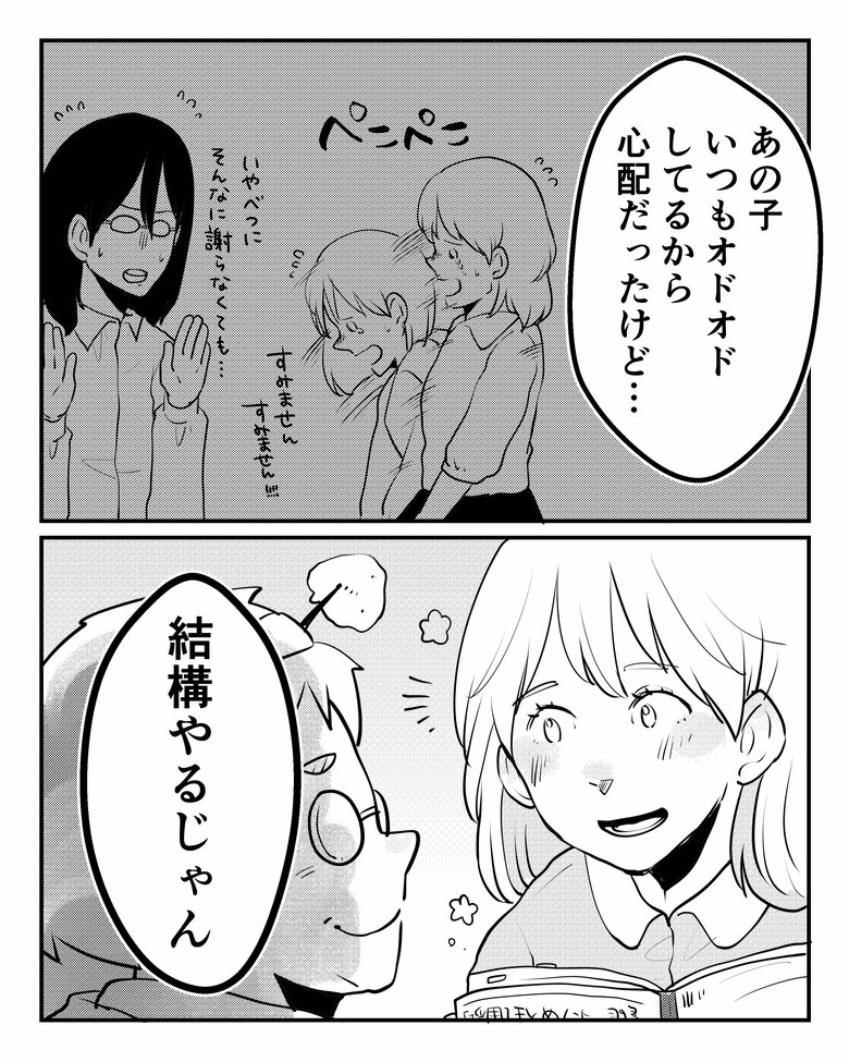 部署イチ難物でオタクな先輩と対等に語り合うハトちゃん。自信にあふれた明るい表情に、周囲の人たちはいつもの彼女とは違う一面を感じ取るのでした。