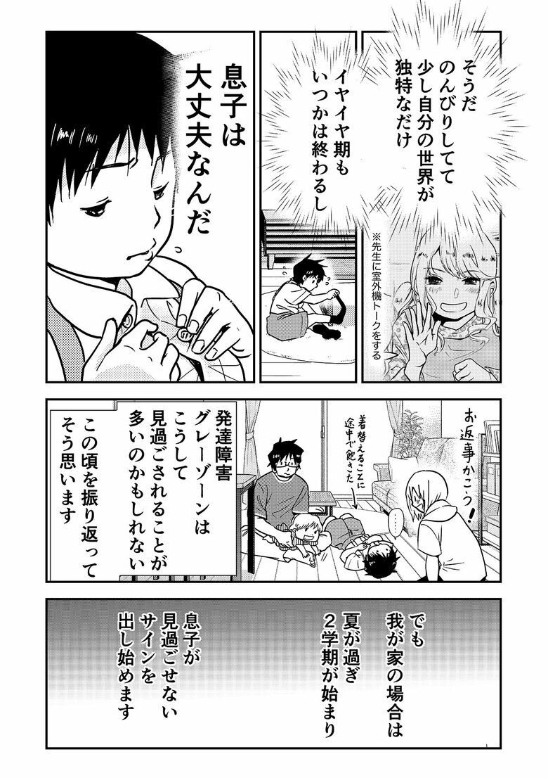 グレーゾーンの息子くんを育てる日々は初めてのことだらけで、戸惑いの連続。同じ境遇をもつ家族の励みになるよう、作者自身のリアルな体験を漫画に綴ります。