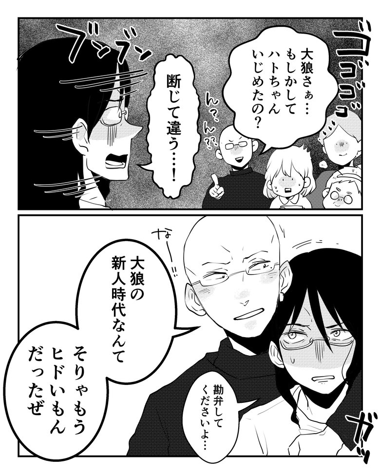 上司・大狼に仕事のミスを指摘され落ち込んでいたハトちゃんでしたが、同僚と話し気持ちを切り替えることができた様子。何かを伝えようと、大狼を呼び止めます。