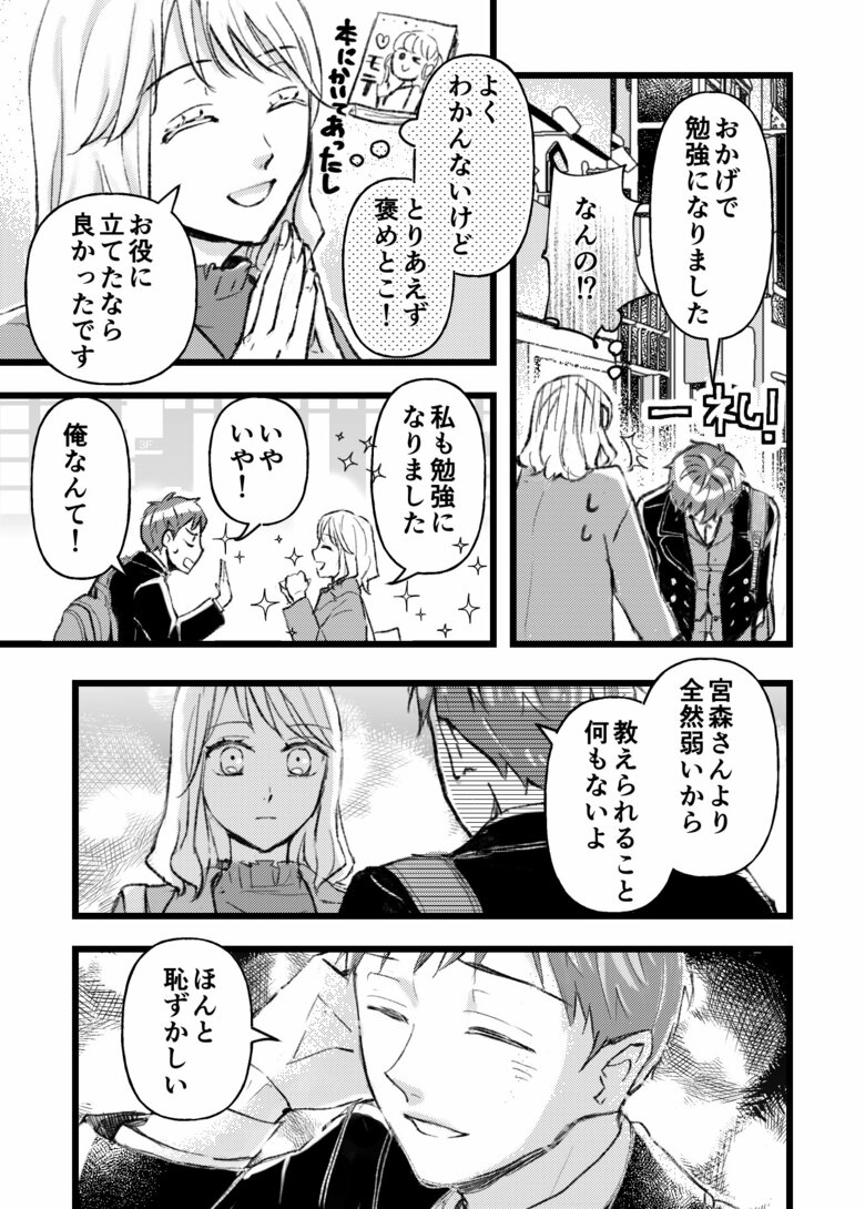 日下さんは「憧れの宮森さんにふさわしい男にならなければ!!」と人知れず努力していましたが、なかなか効果があらわれません。それどころか、当の宮森さんや周辺の人々に守られてばかり。