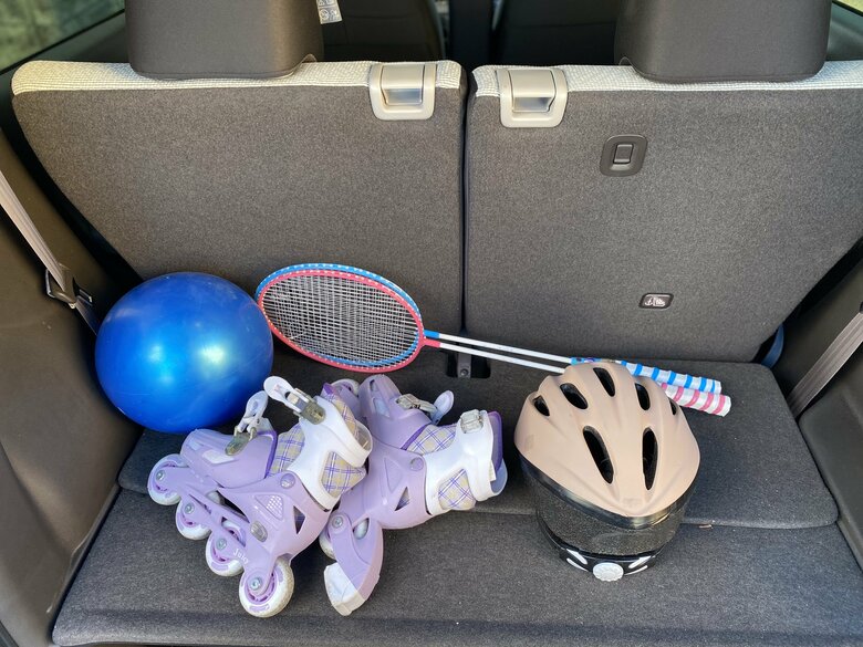 今までは、子どものボールやバドミントン、インラインスケートなどの外遊びグッズを車にガサッと入れて出かけていました。それぞれかさばるアイテムなので、何に収納すればいいのか迷子だったのですが、そのすべてがこのトートバッグにすっぽり!