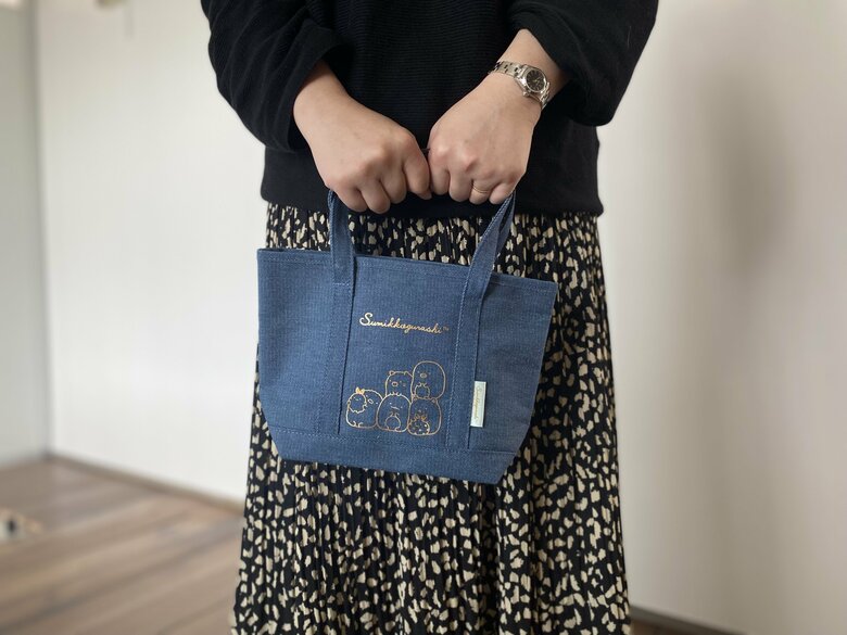 セットで販売中の「すみっコぐらしminiトートバッグ」。こちらもゴールドでプリントされたすみっコたちがぎゅっと身を寄せ合った姿がかわいくてたまりません。ちょっとしたお出かけにもぴったりのサイズ(高さ18cm×幅28cm×マチ9cm)。マチも広めでお弁当箱がすっぽり入るので私がランチバッグとして愛用する予定が、3歳の娘がもれなく欲しがって、手放さなくなってしまいました(笑)。