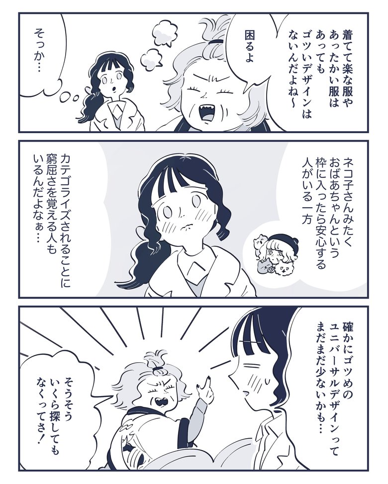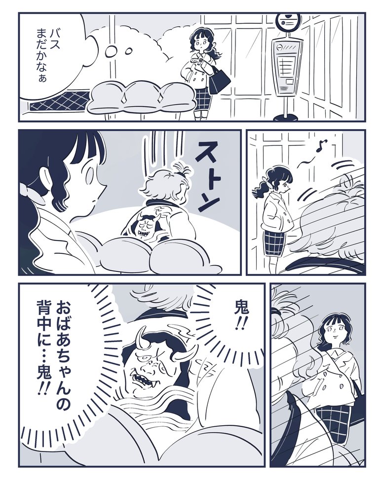 背中に「鬼」が描かれたはんてんを着て、バスを待つおばあちゃん。自分たち世代向けの服にはカッコイイデザインのものがないから「自作!」というおばあちゃんのスタイルに、サトミは感激します。バスに揺られながら、さまざまな鬼デザインに思いを巡らせるのでした。