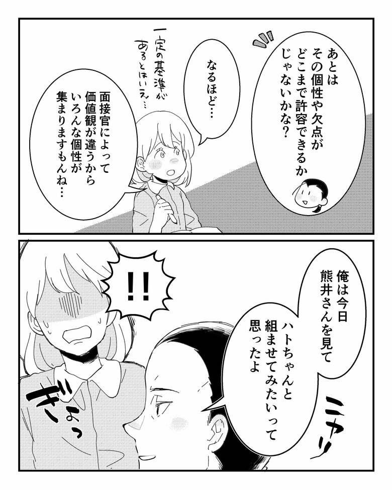 真面目で前向きな彼女らしく、仕事にやる気を見せるのですが、面接にきた学生の態度が悪すぎてまた落ち込んでしまいます。ところが大狼は、その学生に対し「内々定前提」と言いきります。その理由とは──。