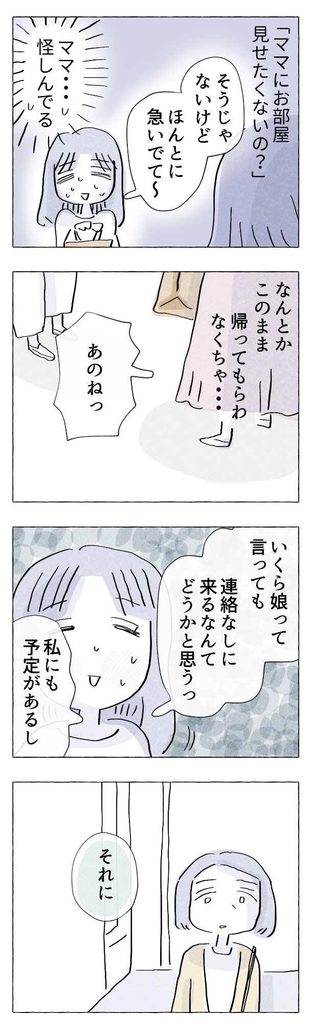 「ママにお部屋見せたくないの?」という恐怖の質問。怪しまれているのをごまかすそうとするも、ついつい本音があふれ出てしまいます。そして恐る恐る母を見てみると…ひきつった表情で作り笑顔をしながら立っているのでした。