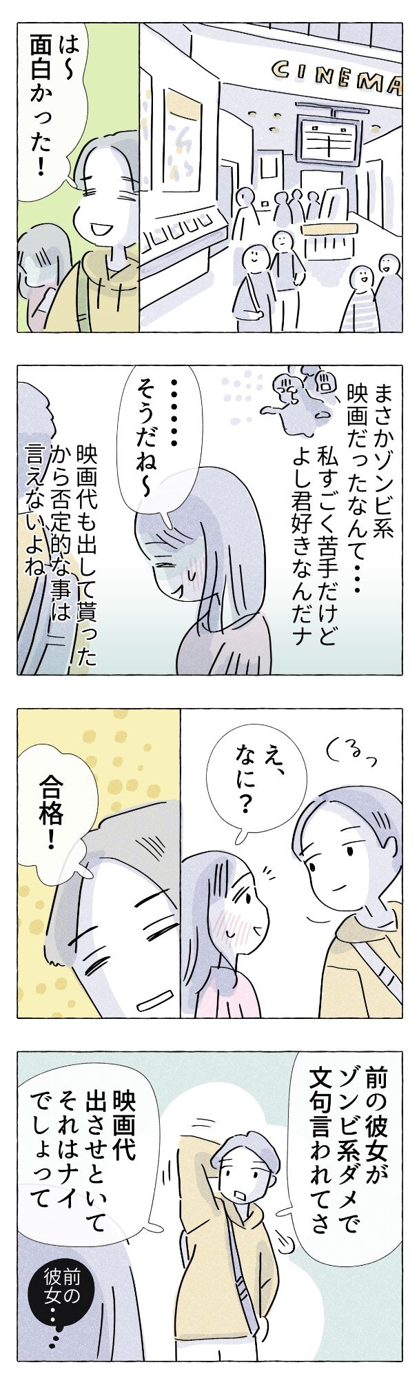 彼との久々のデート。ゾンビ映画に文句を言わない私に「合格」と言う彼。晩御飯用にと買ってきてくれたテイクアウトは、先に食べられた食べ残し。幸せなんだけれど…少しもやっとした気持ちが募ってしまう主人公なのでした。