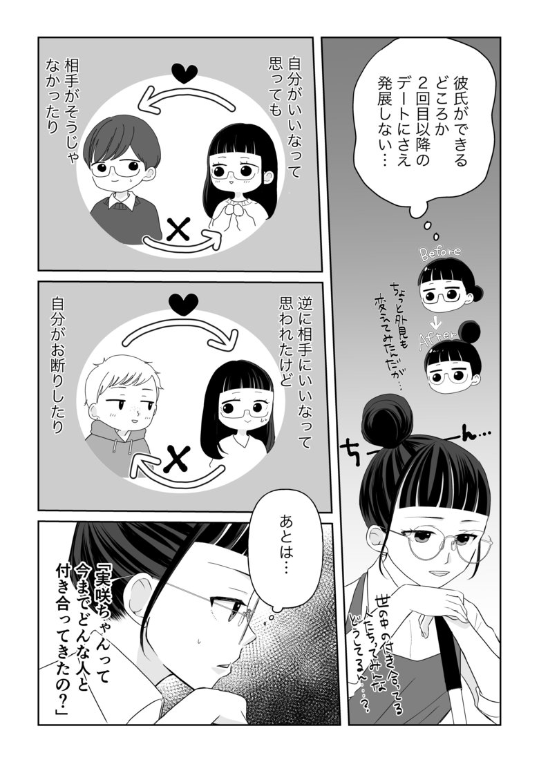 自分がいいと思った人からは好意を向けられず、好意を向けてくれた相手はいいと思えず…どうやったらお付き合いってできるの!?そして自分の経験のなさは男性にとっても不安なのかも、と悩んでしまいました。
