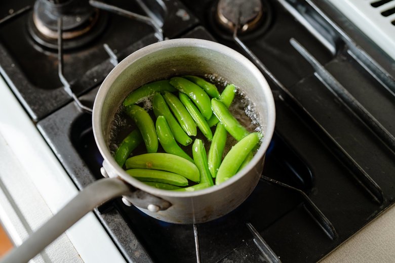 まずは、スナップエンドウの筋を取って塩ゆでします。