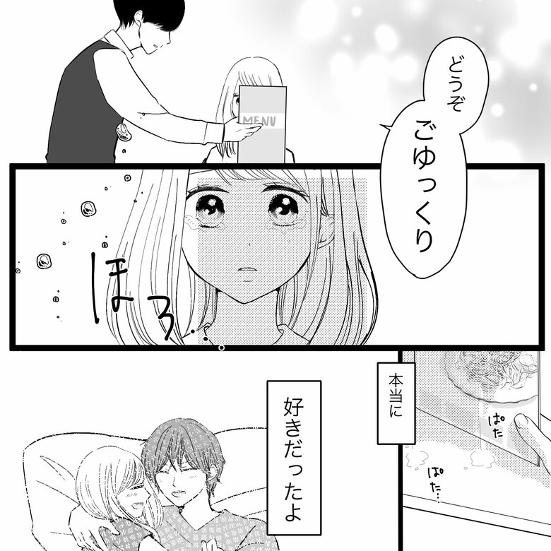 柚に言い返され、辱められたと感じた彼は最後の最後まで柚に暴言を吐くのでした。初めての彼氏だったのに…「付き合わなければよかった」とまで言われ、楽しかったことを思い出し涙する柚。その涙を隠すようにメニューを差し出す奏多。この頃から二人の出会いは始まっていたのですね。