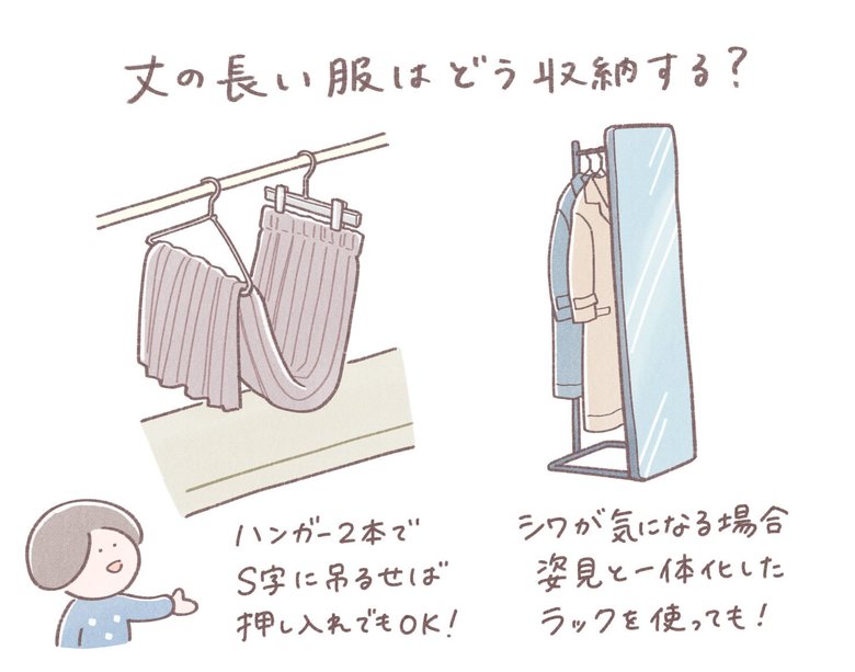 もし素材の特性上シワが気になる場合は、姿見の後ろに短いハンガーラックが一体になった商品などが売られていると思うので、丈の長いものだけ別で収納するのもひとつの手だと思います。