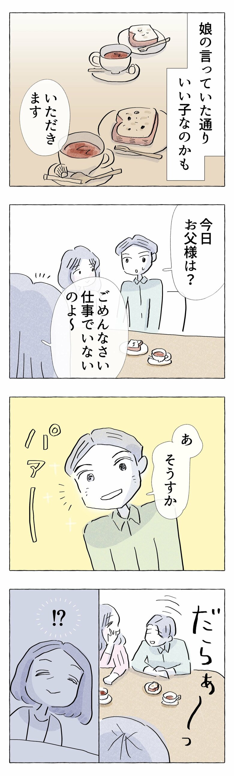 娘が彼氏を連れてきた。娘いわくその彼は、“優しい人”。娘が話す彼の様子に疑問を感じながらも、いざ会ってみたら好青年。