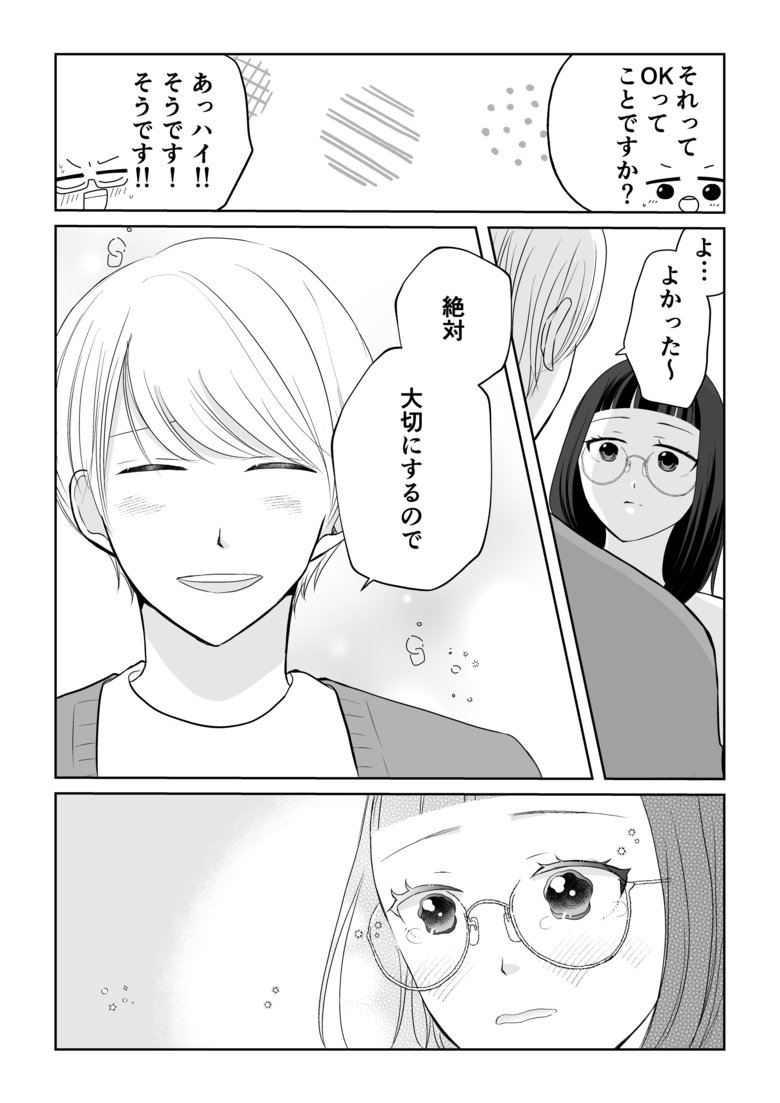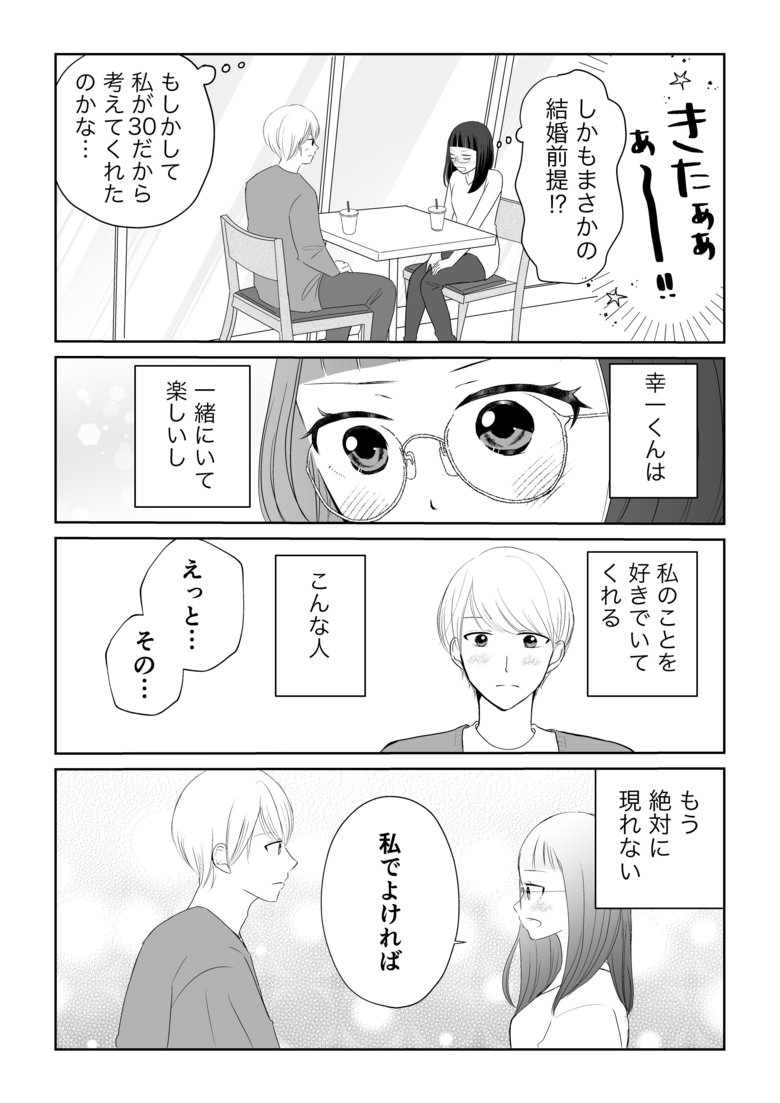アラサーなのに男性経験がないことを伝えた後も花崎とのデートを重ね、期待が膨らんでいく実咲。そしてとうとう告白をされましたが、結婚前提!?驚きながらも、今までのようにネガティブなことは考えず、素直な気持ちで告白を受け入れることができました。