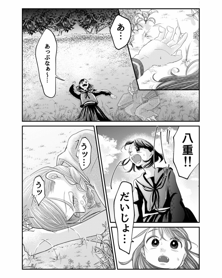 揉み合ううちに土手に落ちてしまった八重と鈴。そこにやってきた武は、ふたりの状況を察することなく八重に話しかけます。その屈託のない笑顔は、八重の心に届くのでしょうか。
