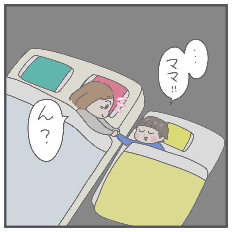 しばらく経ったころ、「ママ!」と声をかけるプニ太くん。やっぱりさみしくなったのかと思い「どした(どうした)?!」「となりにくる?!」と声をかけると、「手だけつなご!」とプニ太くんは答えます。