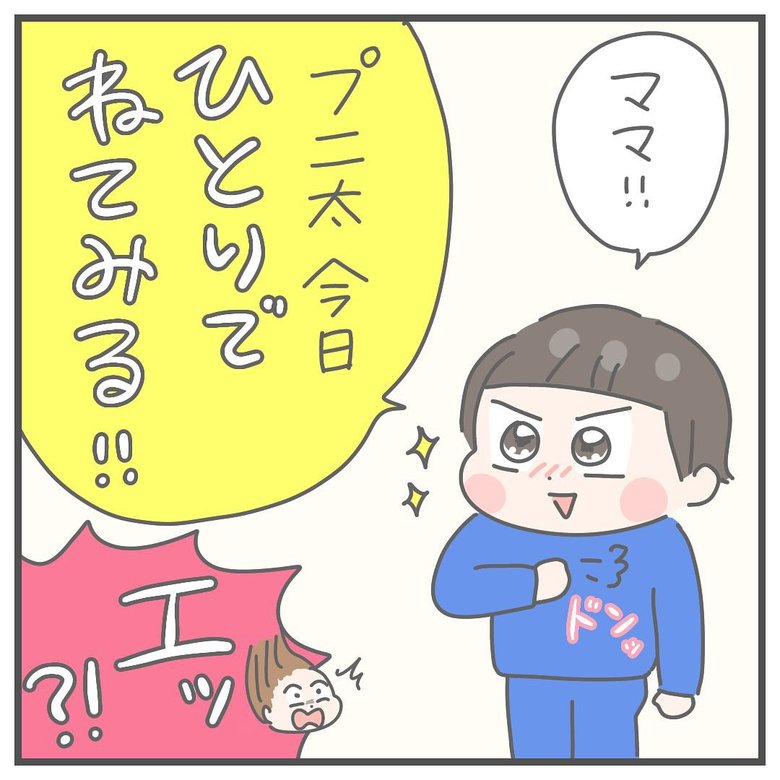 ある日の晩、「ママ、今日はひとりでねてみる!」と言い出したプニ太くん。突然のことで、ぷにまあむさんも思わず「エッ?!」と、声が出てしまったそうです。