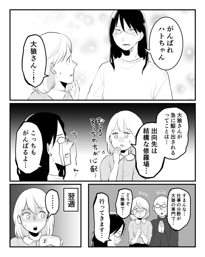 新人同士は険悪、代理上司・亀山は適当かつ多忙、そのうえツールもトラブり、困惑するハトちゃん。心の中で「助けて大狼さん」とつぶやくも、その大狼はさらに過酷な状況にいたのでした。