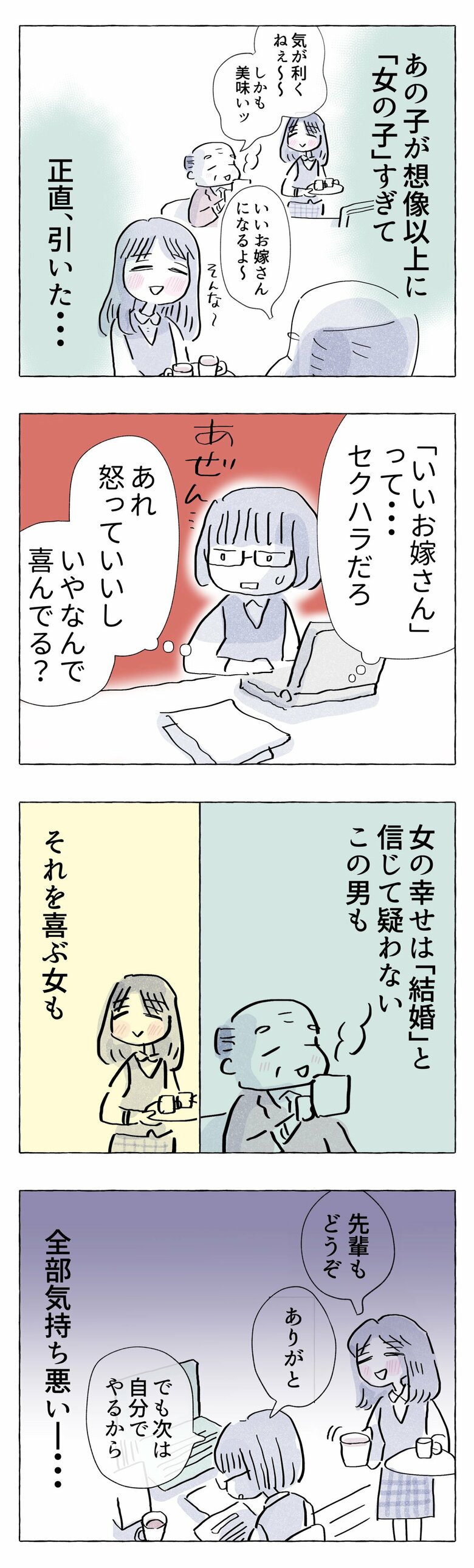「いいお嫁さんになるよ」とセクハラともとれる同僚からの発言にも嬉しそうに笑っている。女の幸せは結婚と信じて疑わない男性も、それを喜ぶ女性も、全部が気持ち悪い。そう感じずにはいられないのです。