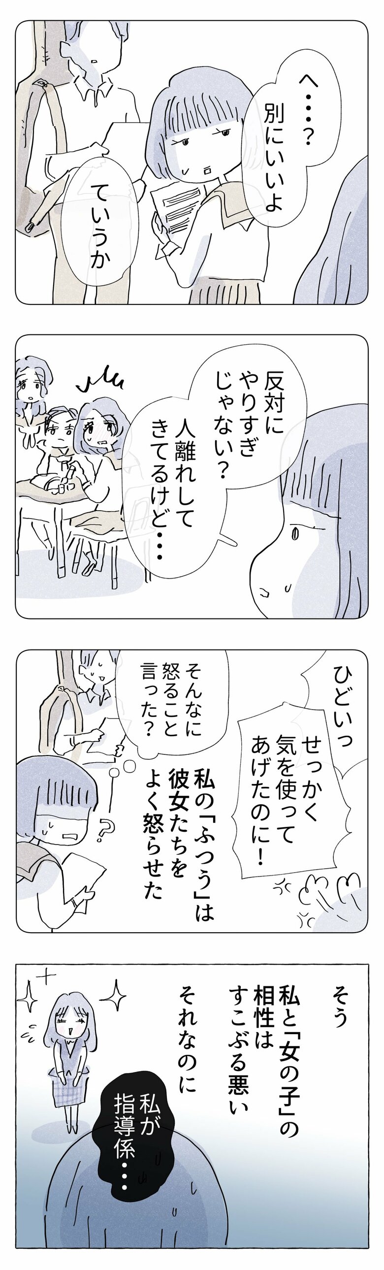 女の子らしい女性とそうでない女性、それぞれの“ふつう”はまったくちがう。そう自覚する会社の先輩。だからこそ同じ出来事やセリフにも、上手に受け流せる・受け流せないに大きなちがいがでてくる。
