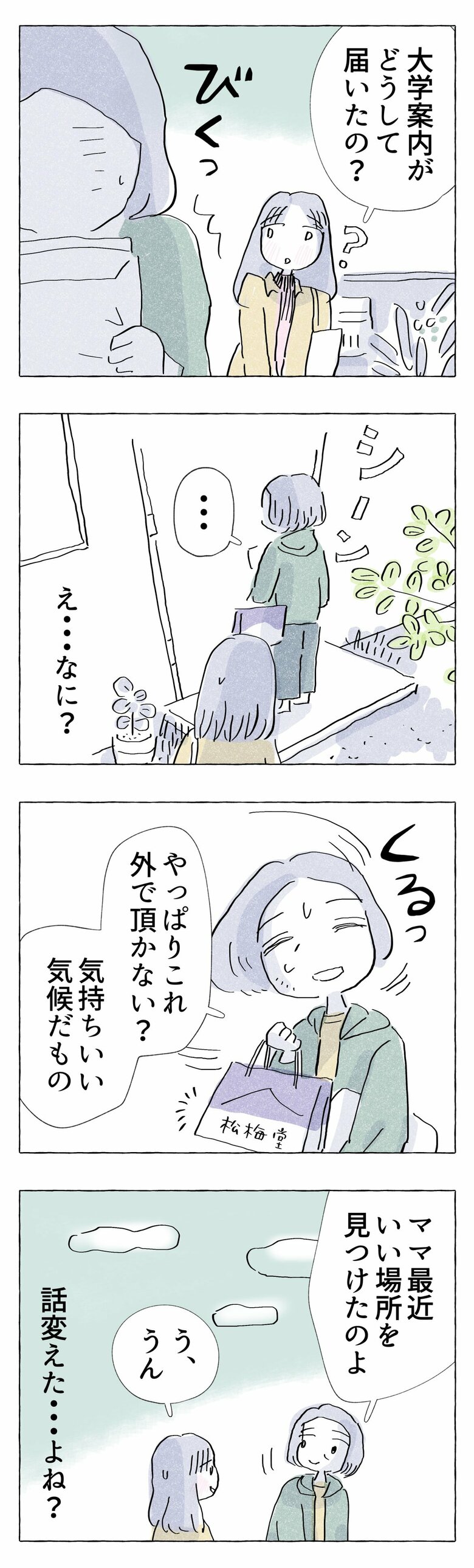 久々に会った母が少しずつ変わっていた。雰囲気も違うし、母宛ての大学案内についても話をそらされてしまいました。