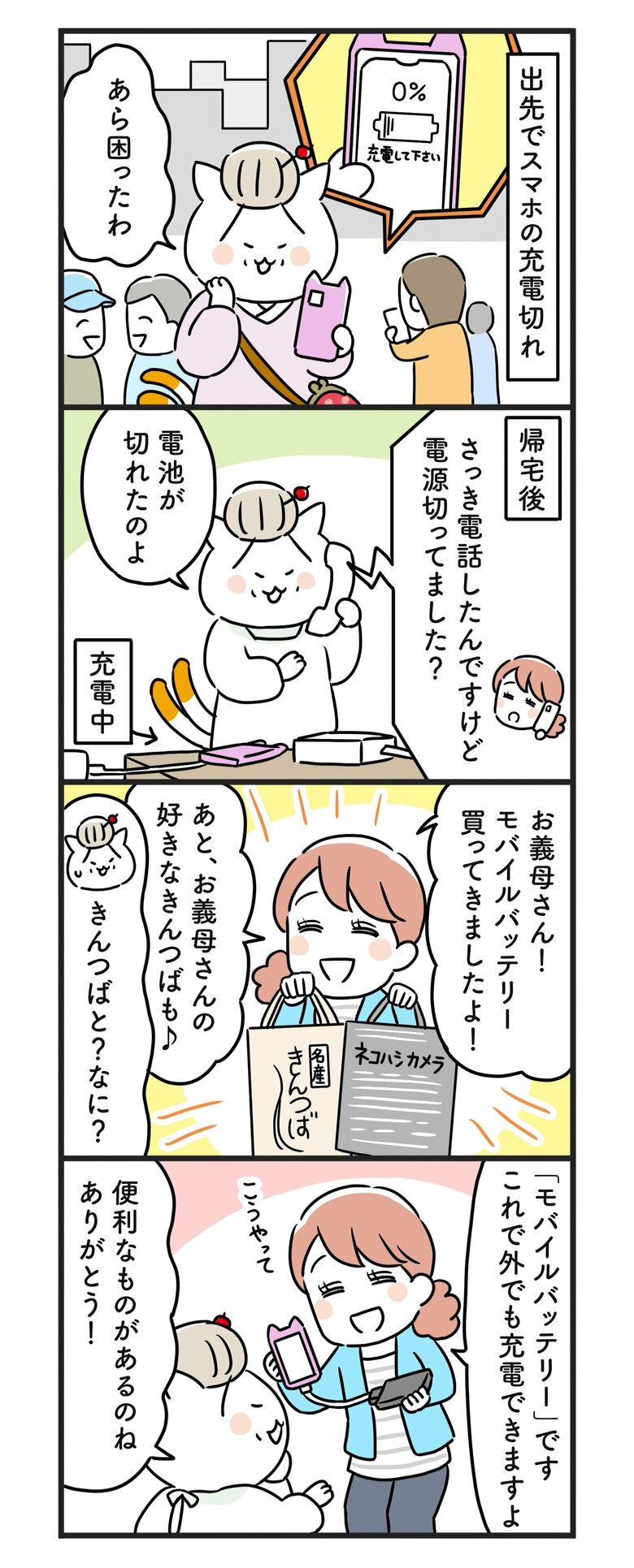 出先で携帯の充電が切れがちなウメコのために充電器を買って帰ってきたマミ。一緒に買ってきたきんつばは、実は自分が食べたいという目論見もあったものの──。
