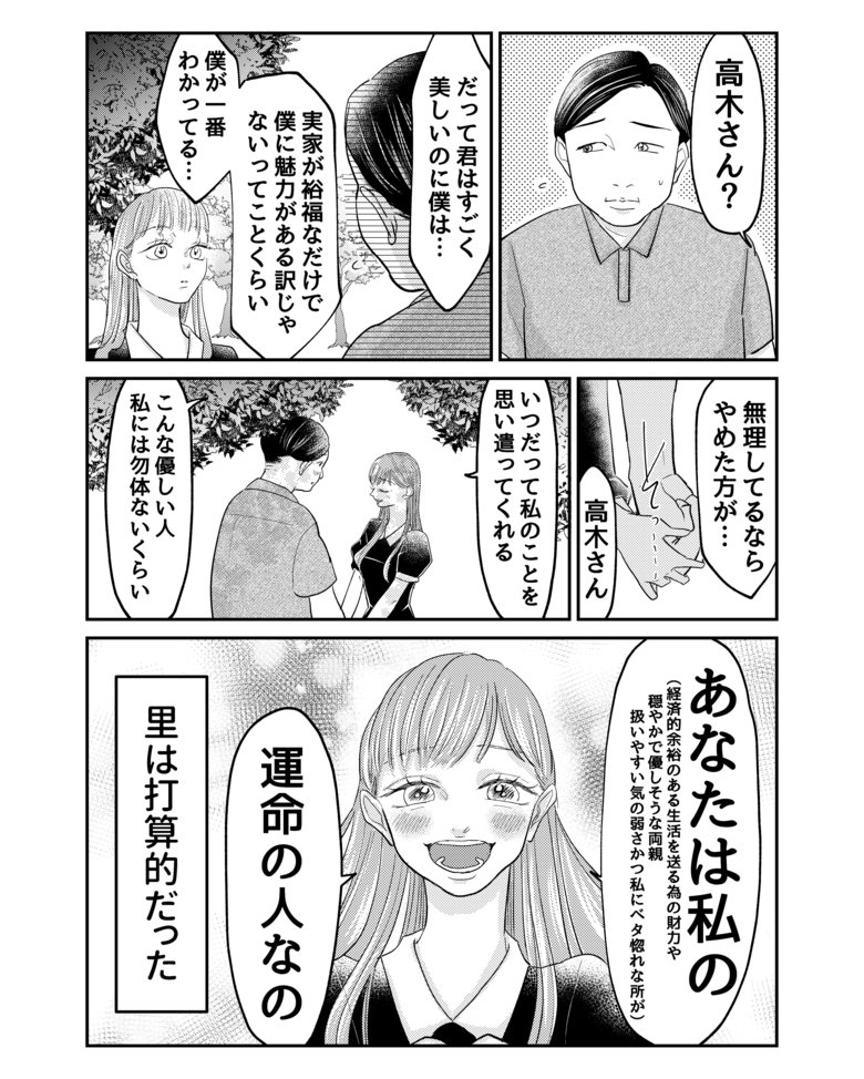 「(いろいろ理由はあるけれど)あなたは私の運命の人」。財力や両親、相性の良さ…細かい計算は見せない、シンプルかつ力強い言葉で、結婚相手を安心させる里なのでした。
