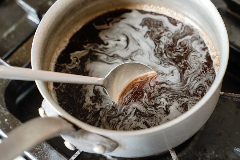 まずは、アイスコーヒーときび砂糖を小鍋に入れて、沸騰する直前まで温めます。