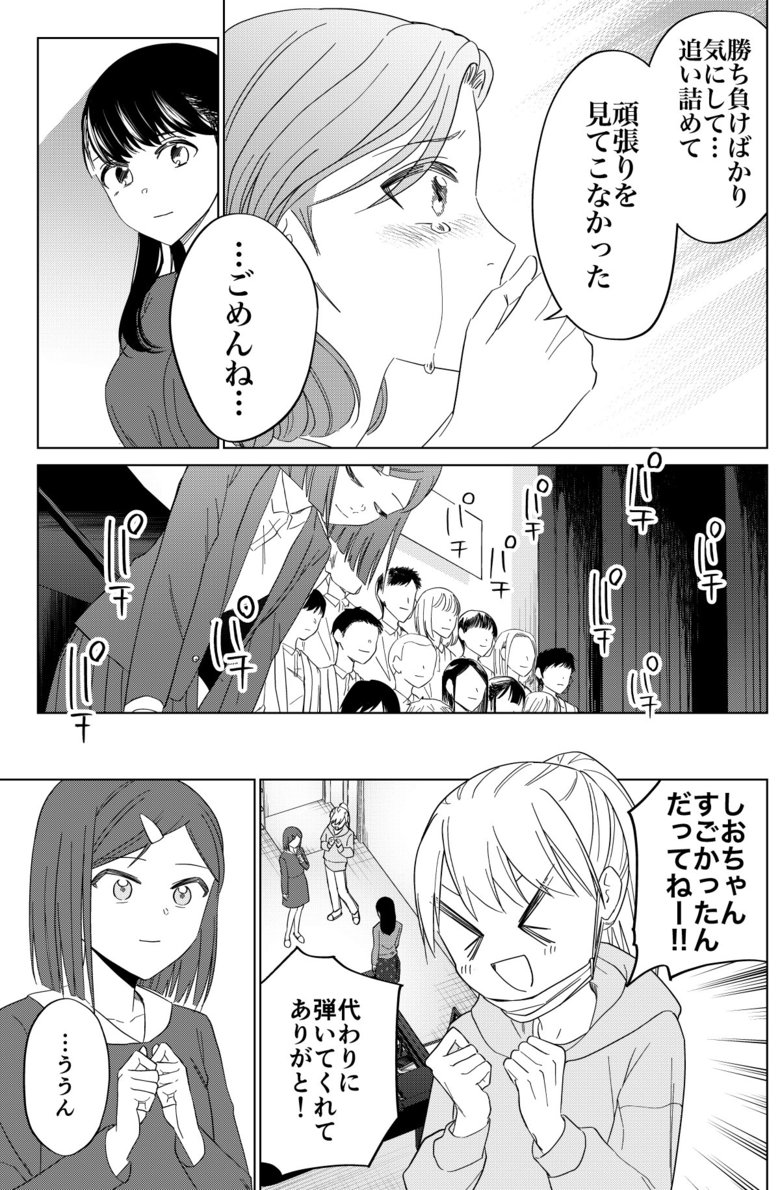 中学受験を控え、教育熱心な母親に校内のオーディションに落ちるぐらいならと、ピアノをやめさせられそうになっていた塩田さん。そのプレッシャーもあり、対照的な性格の明るく陽気な佐藤さんと衝突してしまいましたが、お互いの気持ちを伝えることができた二人は無事仲直りできました。