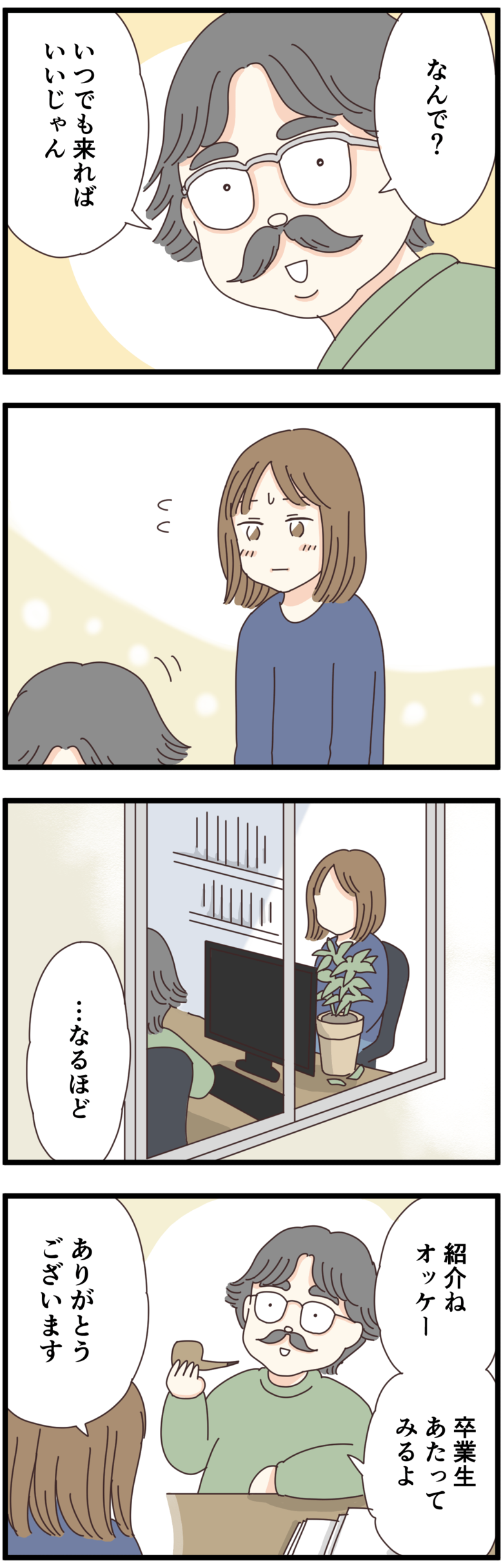 連載トップへ戻る 「そのときの私には命綱だった」ダメ就活生以外の部分で見てくれる人とのつながり コジママユコ 4コマ・漫画 2023.09.05 漫画家・コジママユコさんが、自身が経験した就活の日々を描きます。もがき苦しんだ先に見つけた自分らしい生き方とは?かつて就活に悩んだ人も、今悩んでいる人も…あなたに送るエールの物語です。 漫画を読む 第42話「そのときの私には命綱だった」ダメ就活生以外の部分で見てくれる人とのつながり 作/コジママユコ この記事の写真をすべて見る(4枚)