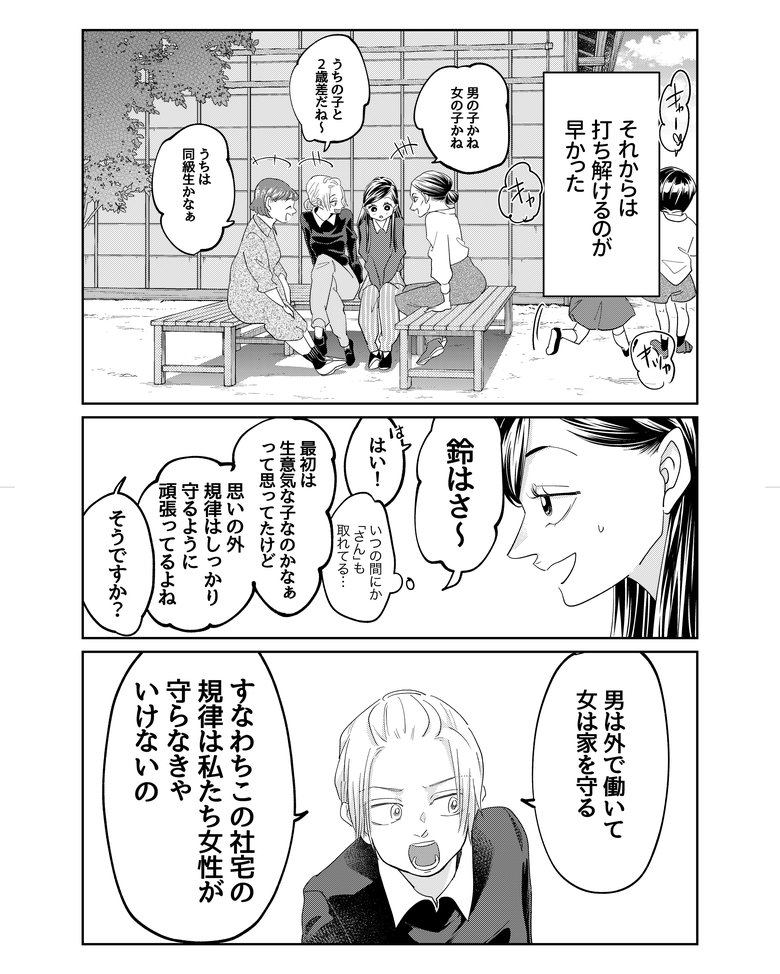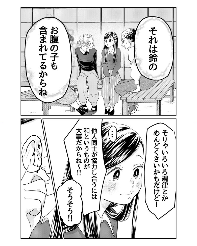 妊娠をきっかけに社宅に住む婦人会の女性たちに仲間としてようやく認められた鈴。「他人同士が協力し合うには和というものが大事だから」と、社宅内の厳しい規律の裏にあった想いを知ることになります。