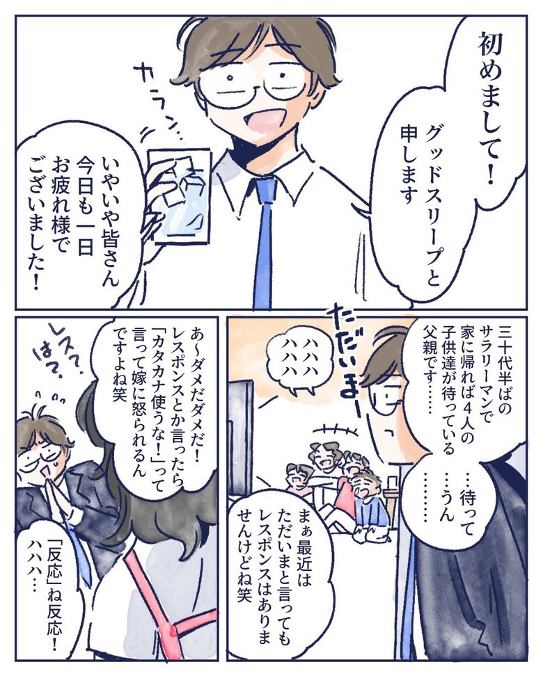4人の子どもを育てながら汗水を流すアラフォーサラリーマンのグッドスリープさん。今日も仕事に育児と体力の限界!そんな日常の中で体験した失敗や苦悩を伺いました。落ち込んだ時も一日の終わりにこの漫画を読めば元気になれる!?