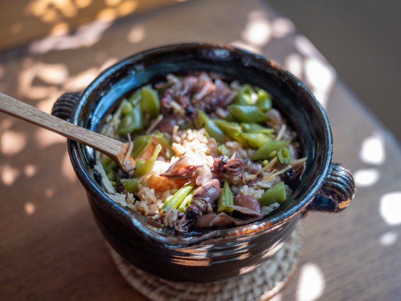 「春の終わりにホタルイカとスナップエンドウの炊き込みご飯」