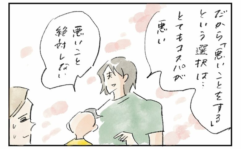 19歳年上の夫とふたりの子どもたちと暮らすイラストレーター、よこみねさやかさん。小学生の息子の悩みに答える夫の発言に、数々の名言が散りばめられていることに気づいたそう。「悪いことをしちゃいけない理由がわからない」と言う息子くんに、今日も独自の主張を展開します。