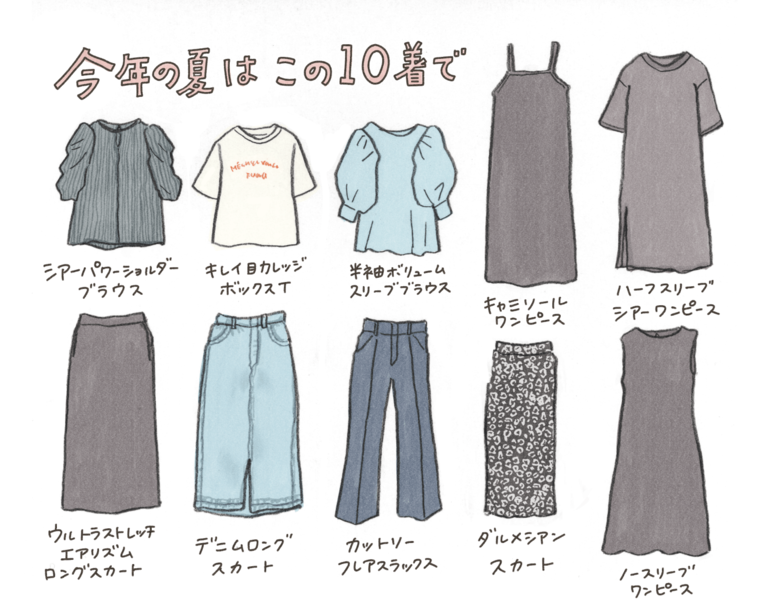 今年は暑くなるのが早かったですね。4月末くらいに夏服を用意しましたが、おかげで夏日も快適に過ごせました。今年の夏はこの10着で過ごしています。