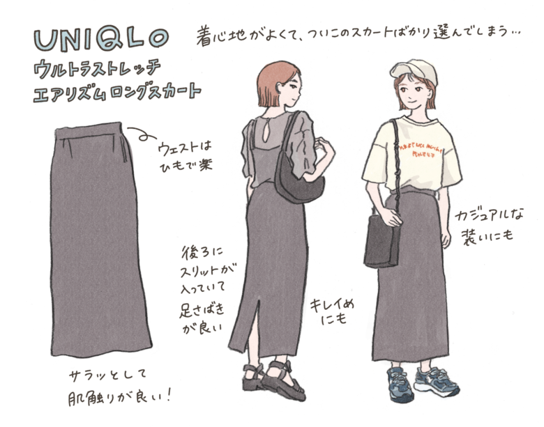 また、今年は全体的にカジュアルめのコーデにしようと思い、アイテムを選んでいきました。ここ4年ほどは観劇のためにオールシーズンきれいめの服も用意していたのですが、ずっと追っていたコンテンツが終わってしまったため観劇の機会が半減しました。そこで、快適性重視かつ冒険でカジュアルなアイテムを取り入れました。中でも特に購入してよかったと感じ、ヘビロテしているのがユニクロの「ウルトラストレッチエアリズムロングスカート」です。