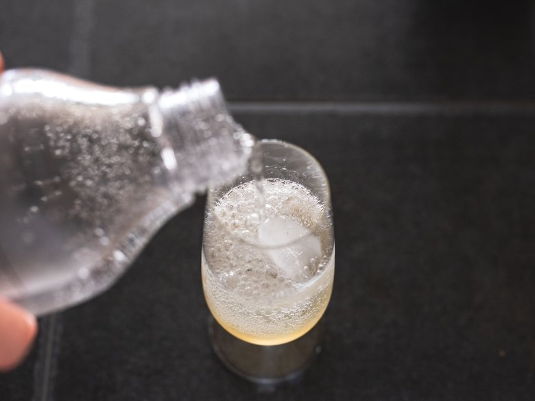 ⑤グラスに氷を入れて、お好みの量の❹と炭酸水を注ぎ、出来上がり。