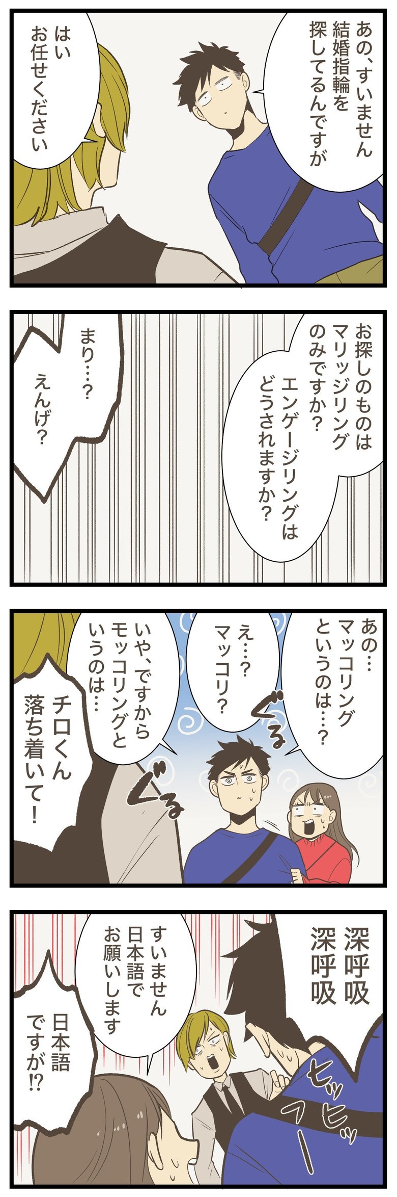 プロポーズの前に、結婚指輪を見に来たミロチさんとチロくん。マリッジリングやエンゲージリングなど聞きなれない言葉に「マッコリング…?」と混乱するチロくん。店員さんに説明してもらうなかで「婚約指輪っていつ必要になるんですか?」とふと疑問に思います。