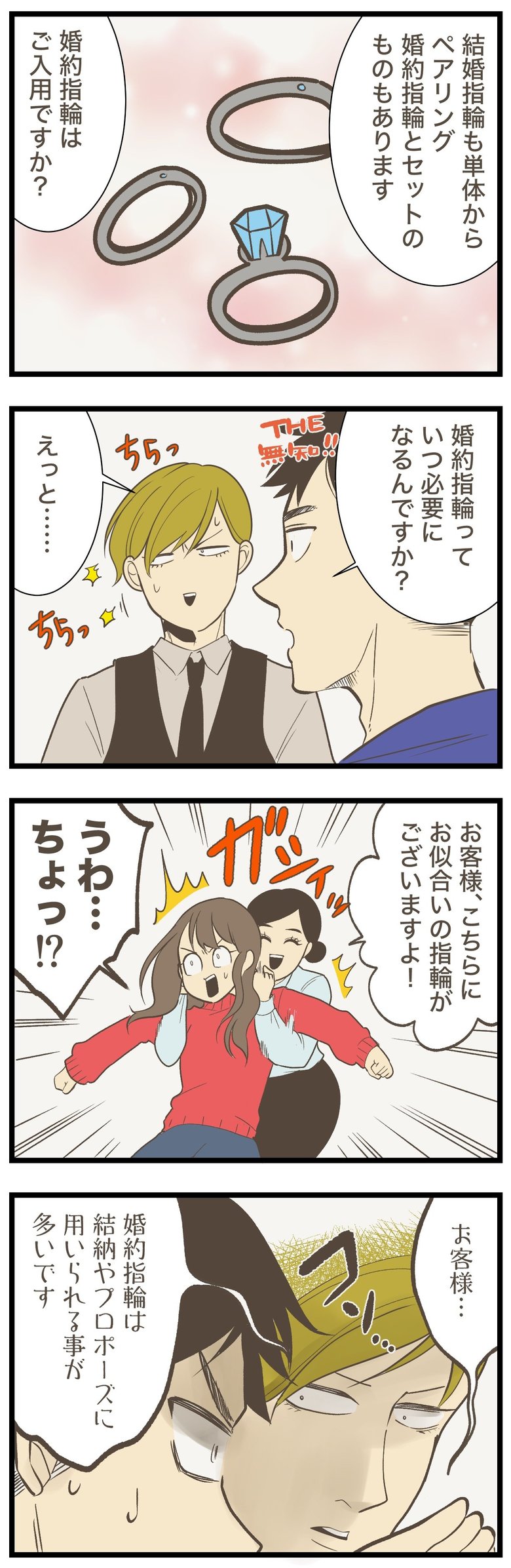店員さんに「結納やプロポーズで用いられることが多いです」と教えてもらい、プロポーズを計画しているチロくんは「それにします」と即決!これに店員さんは「彼女さんの好みを聞いた方が…」と焦りますが、遠くからそのやりとりを見ていたミロチさんも「じゃあそれで」とこれまた即決!